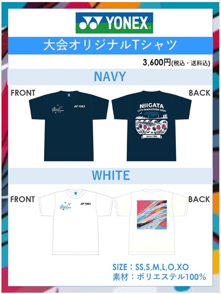 大会のキービジュアルをイメージした<WHITE>、チューリップや萬代橋をモチーフにした<NAVY>の2種類をご用意。