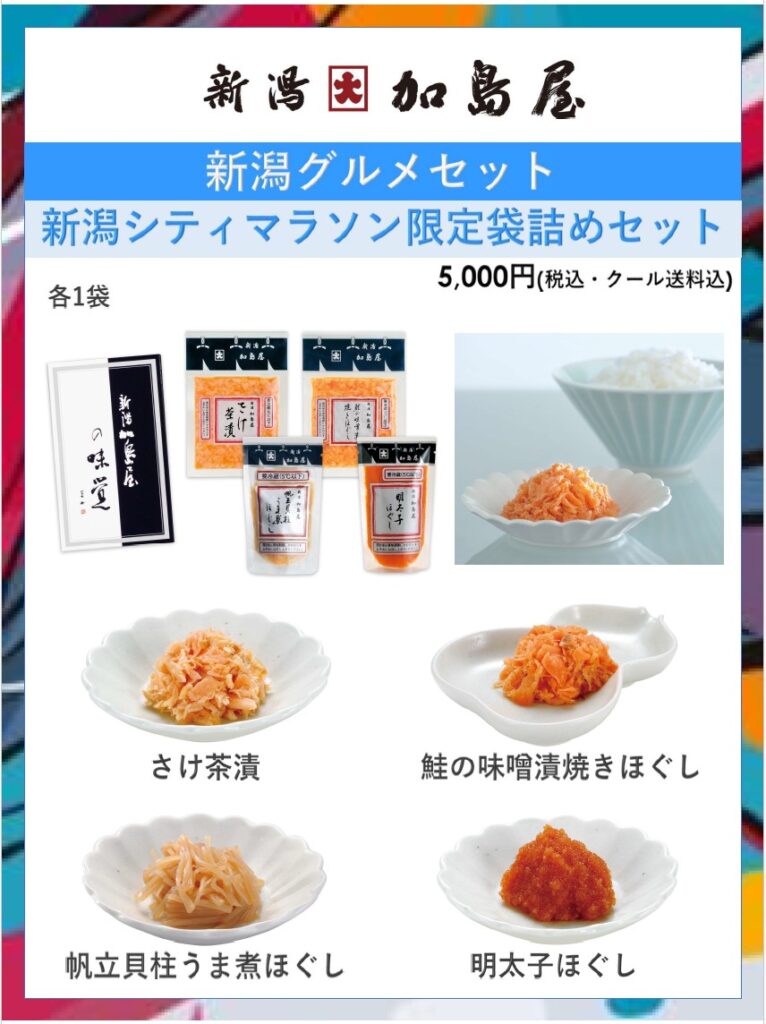 創業170年、新潟が誇る老舗加島屋が新潟シティマラソンエントリー者限定のグルメセットをご用意しました。